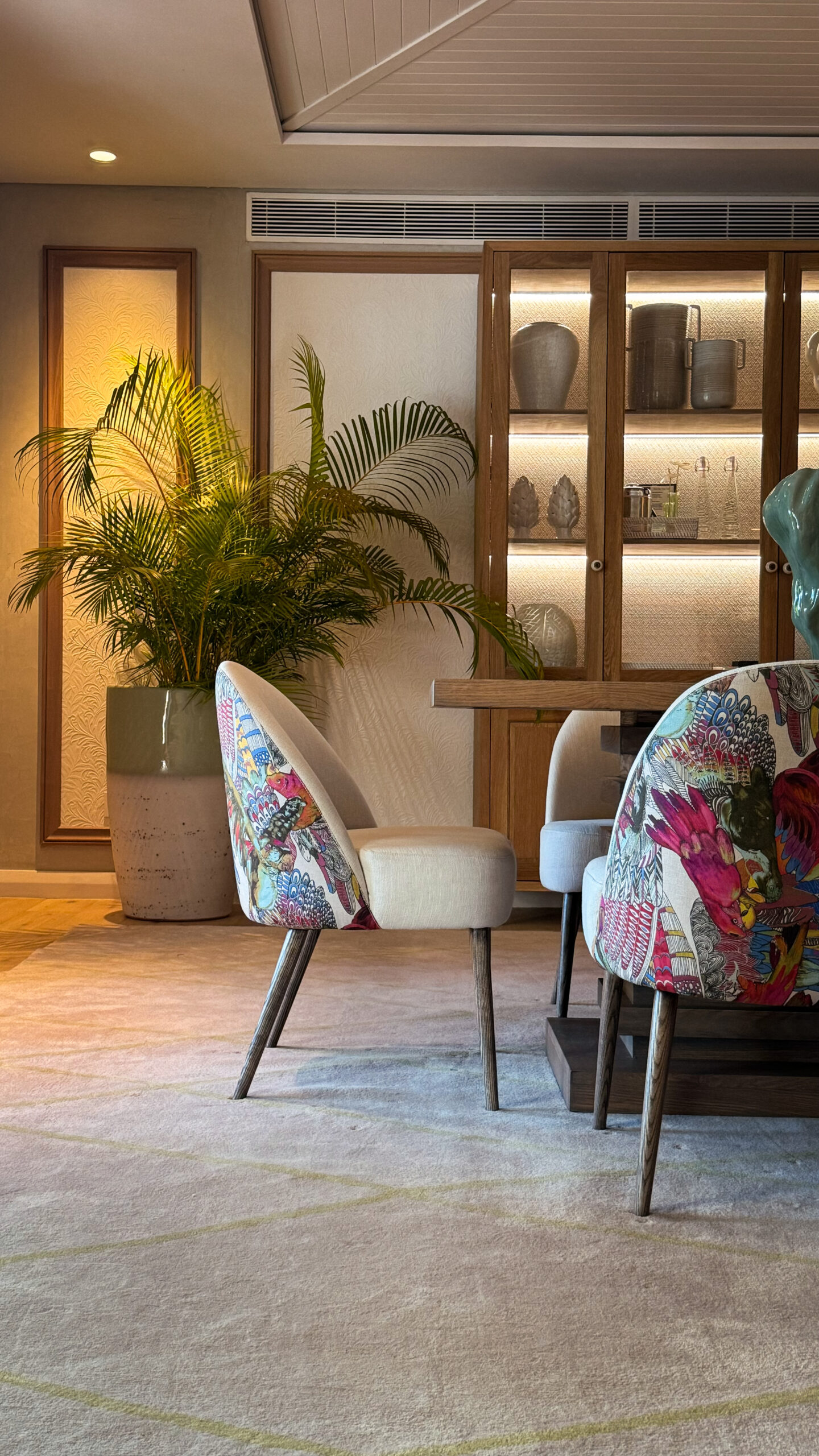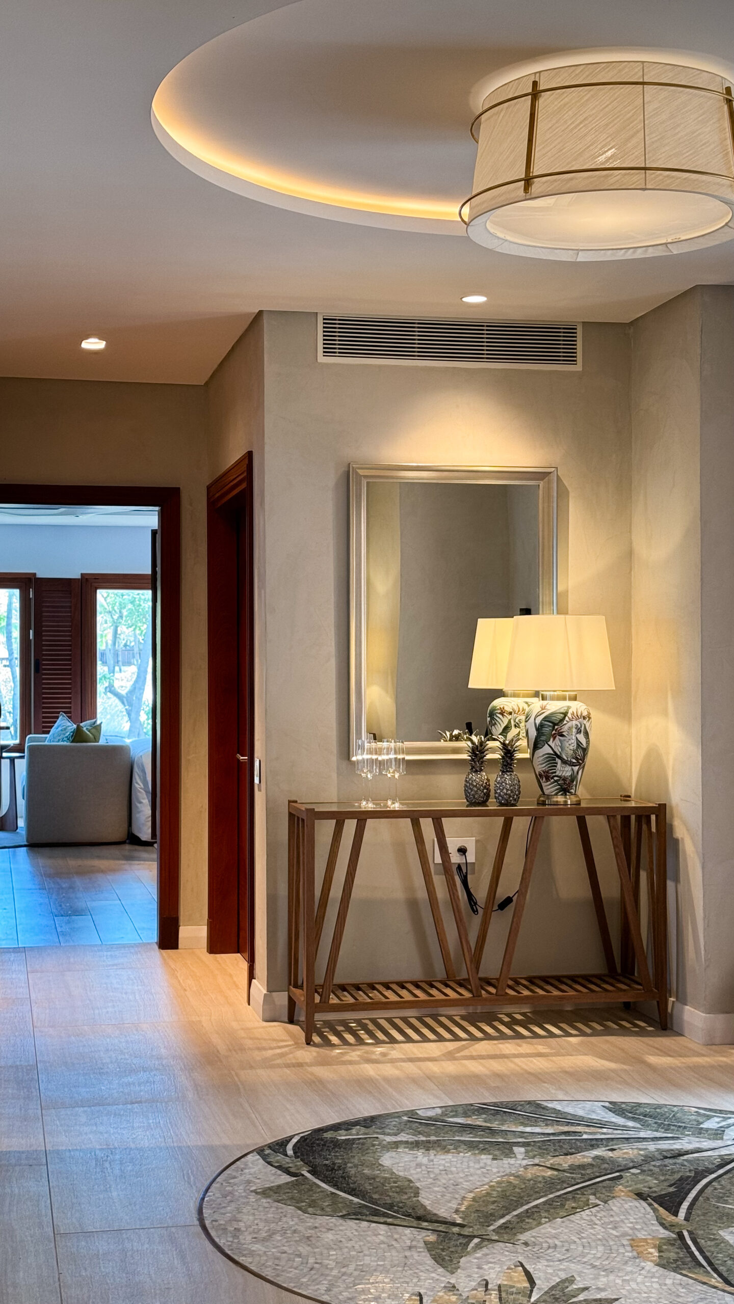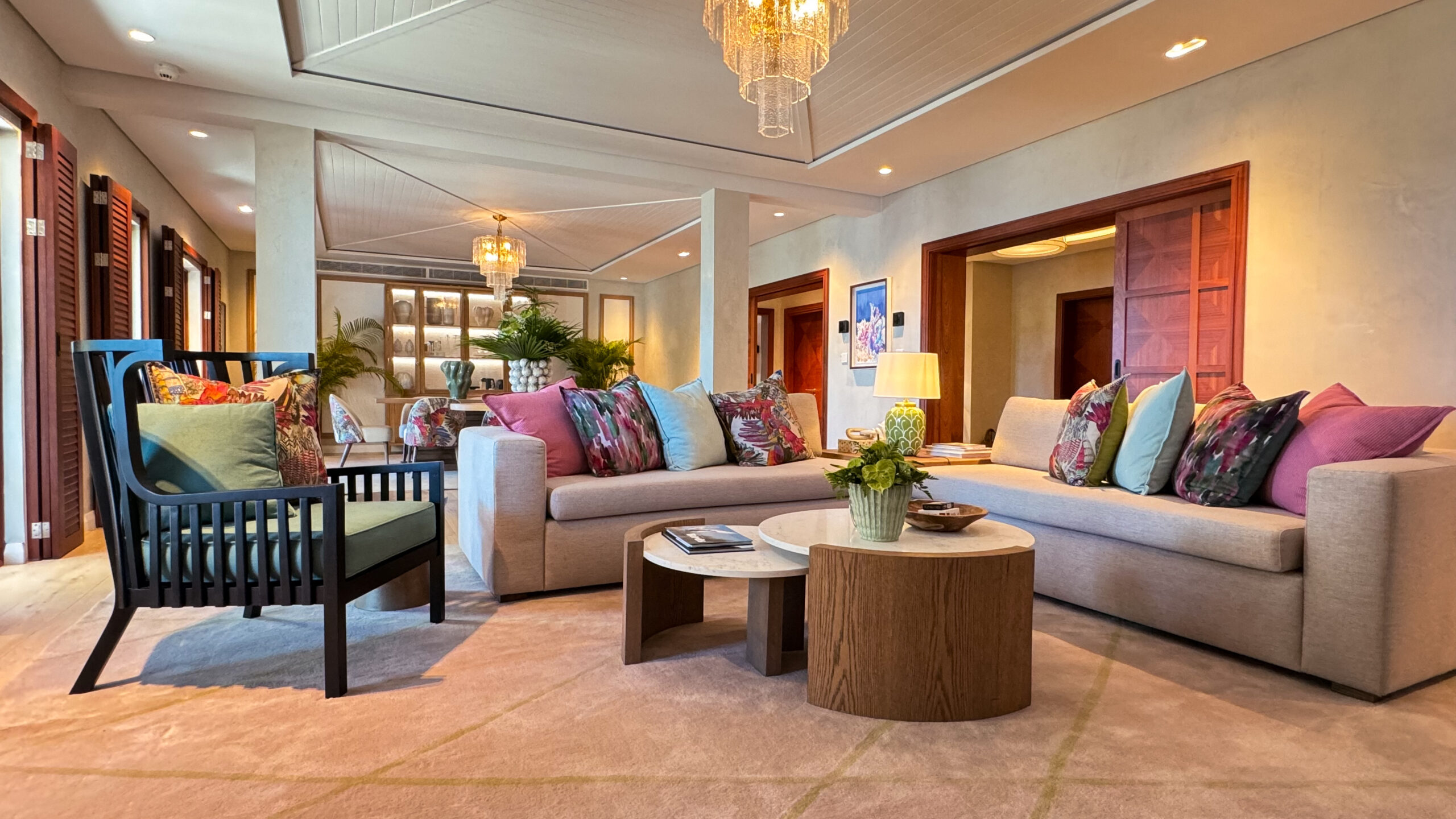 Nestled among swaying palm trees on the upper floor, the Presidential Suite at the Hilton Mauritius Resort and Spa delivers an unparalleled luxurious guest experience. Boasting two guest bedrooms with ensuite bathrooms and private balconies directly overlooking the ocean, alongside a spacious lounge, dining area, and a sprawling terrace with built-in seating, the Presidential Suite emerges as a serene oasis, ideal for an indulgent tropical retreat. Harmonizing calming neutral tones with vibrant pops of blues, greens and pinks, the space exudes sophistication, freshness and an undeniable sense of tranquillity, promising guests an unforgettable stay.