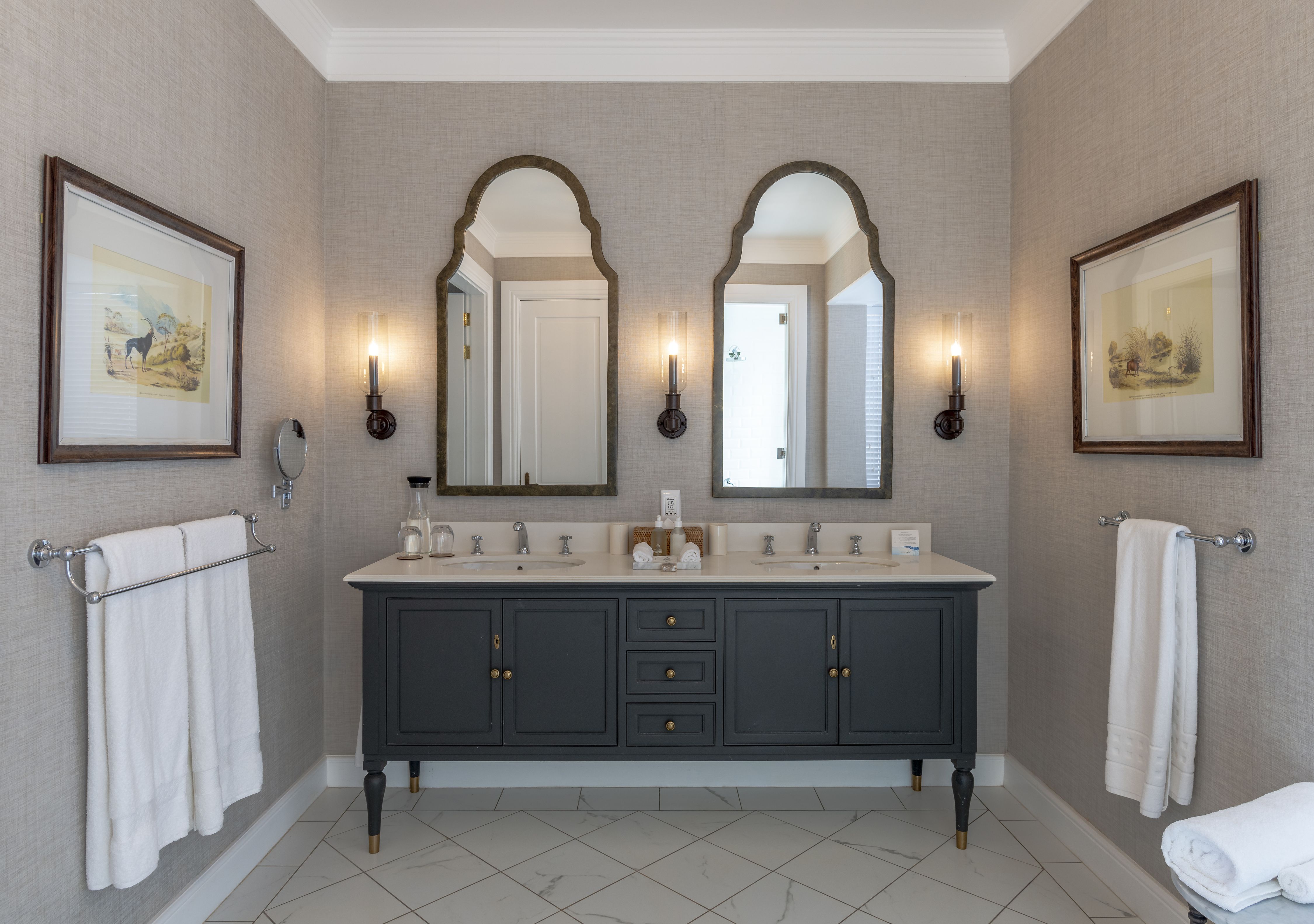 The walls of the guest rooms are covered in traditionally styled timber paneling and wallpaper, bathrooms have crisp white marble floors with generous showers and bathtubs. All furnishings have been selected to reflect a colonial style putting emphasis on luxury and comfort.