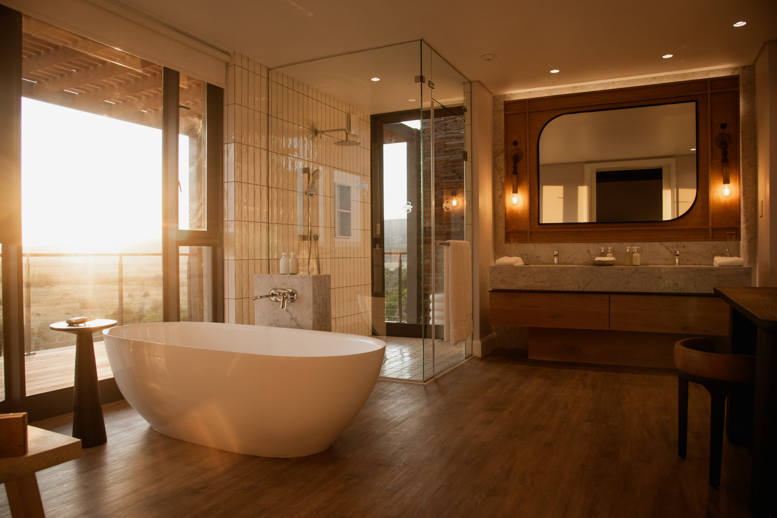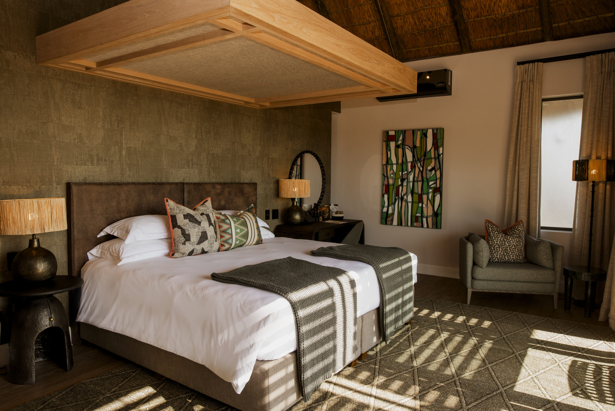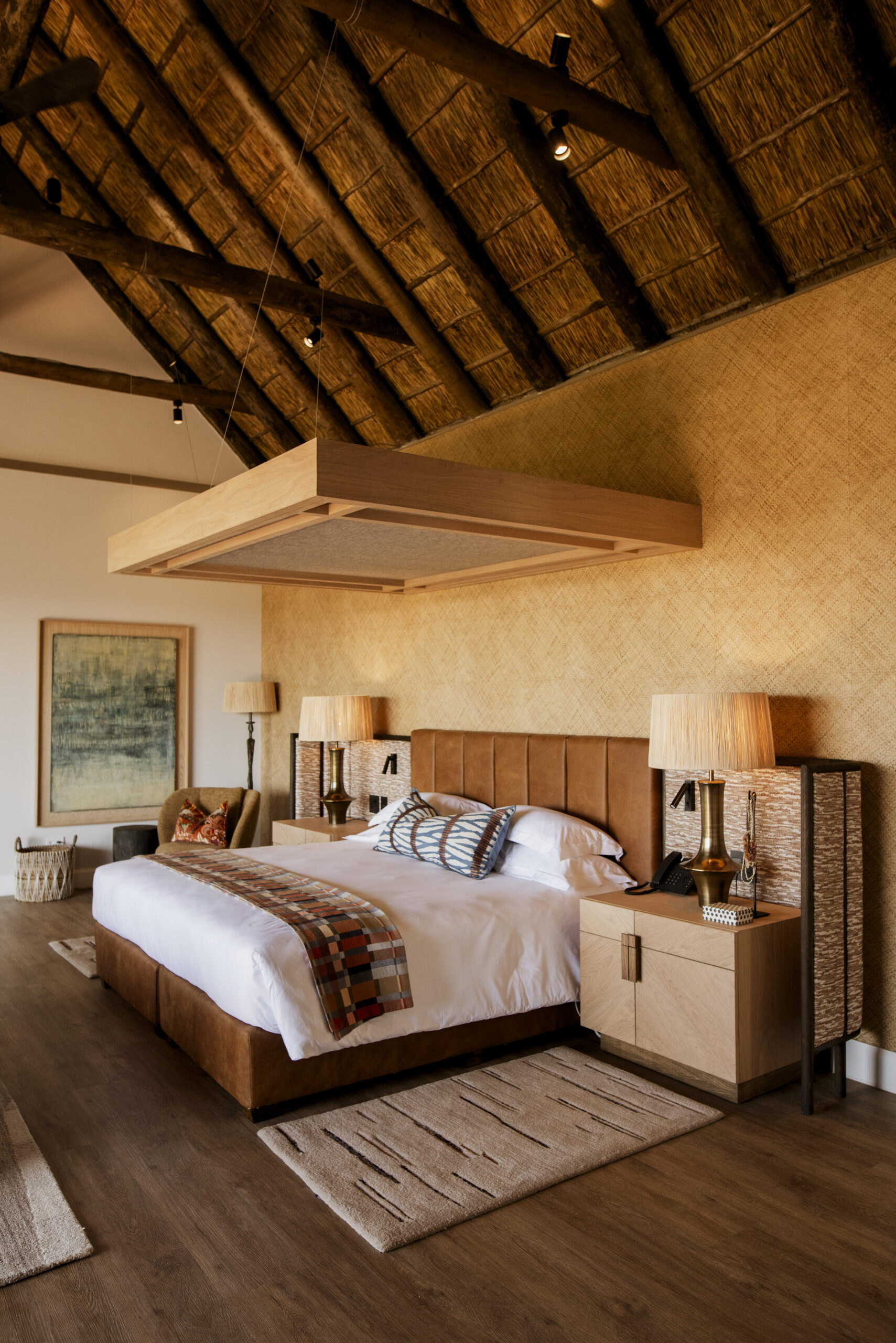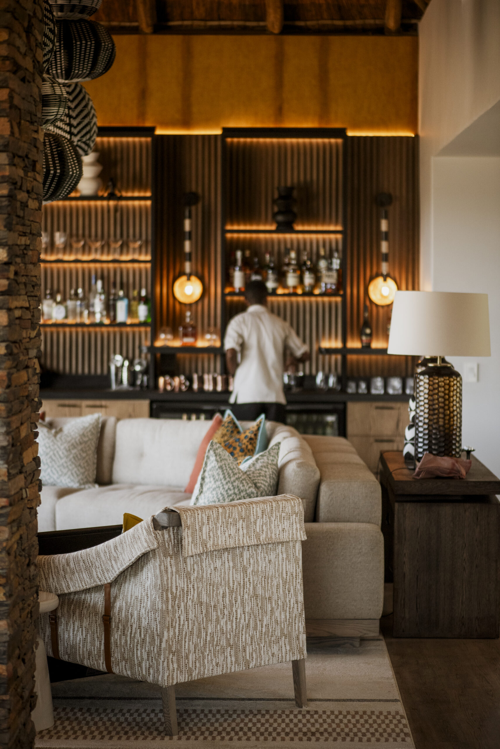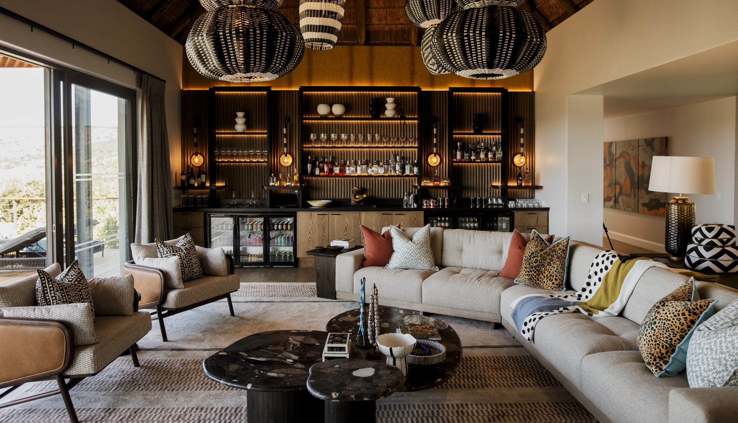 Every room in the villa is designed with a focus on simplicity and elegance. The open-plan lounge and bar area invite relaxation and conversation, with large windows framing sweeping views of the reserve. Natural materials such as wood, stone, and woven textiles are used throughout, enhancing the connection to the surrounding landscape while maintaining a refined, modern atmosphere.