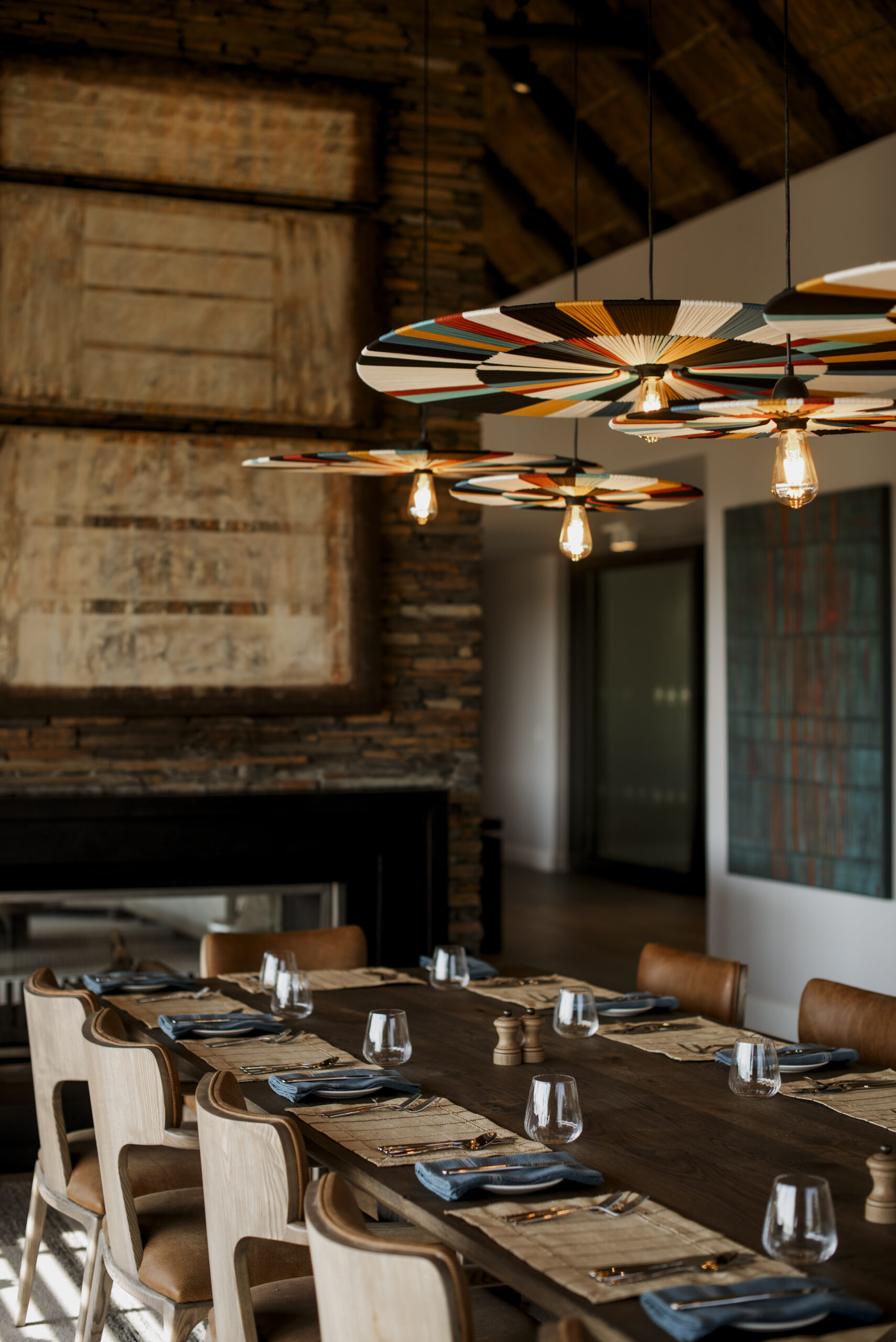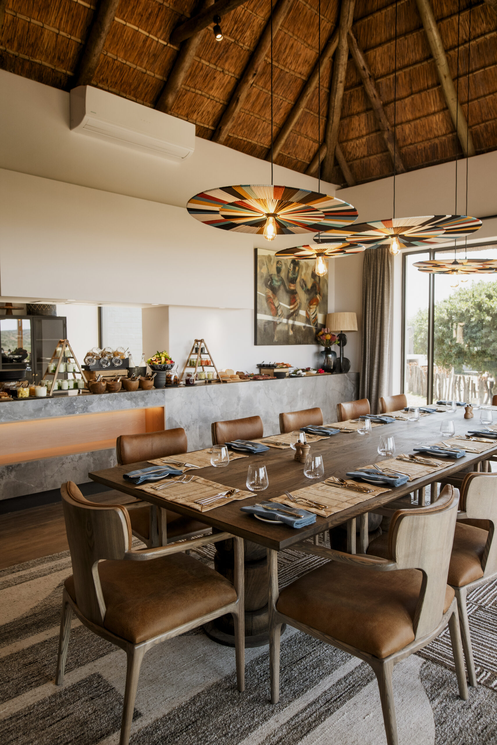 The dining room offers an inviting space for shared meals, with design elements that incorporate handwoven baskets, bespoke furniture, and contemporary African art. The view decks extend the living spaces into the outdoors, offering stunning vistas and a seamless flow between interior and exterior.